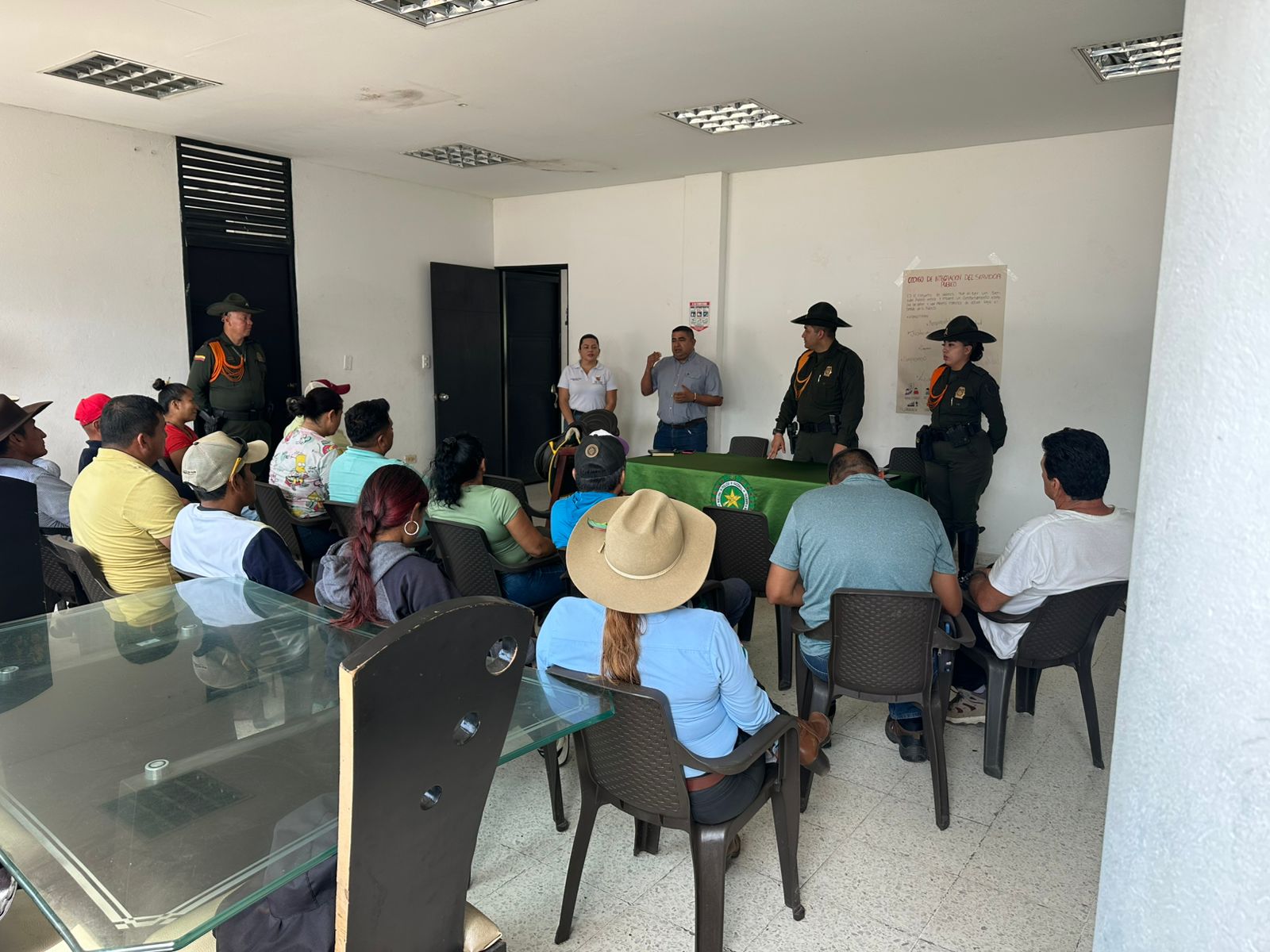 Durante la actividad se abordaron temas como abigeato, hurto, maltrato animal, tenencia responsable de mascotas y la aplicación de la Ley 1801, explicando el marco normativo, competencias, multas, sanciones, convivencia…