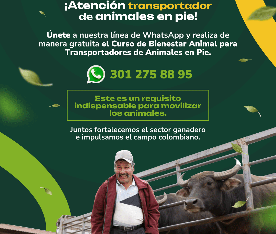 Para dar cumplimiento a lo exigido en la Resolución 20223040006915 de 2022 expedida por el Ministerio de Transporte y el ICA, las dos entidades invitan a los transportadores de animales en pie, que aún no cuentan con el certificado en bienestar animal para que realicen el curso, el cual es obligatorio para la movilización de los animales. El certificado puede ser exigido por las autoridades nacionales en las carreteras del país, así como en los sitios de cargue y descargue de los animales.